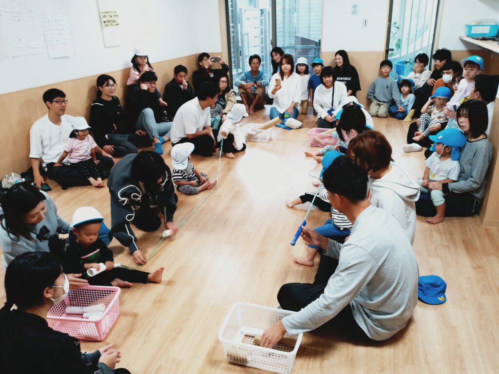 1.2歳児さんたちも保護者の方の助けを借りて右から左へと一生懸命ペーパーの芯を移動させてくれました。(お家の方が一生懸命のようにも見えました笑)