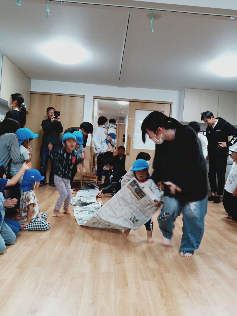 ヒモヒモアナアナは1.2歳児さんが競っている時、3歳児以上のお友だちが『がんばれー!がんばれー!』と大きな声で応援してくれていたのが印象的でした。