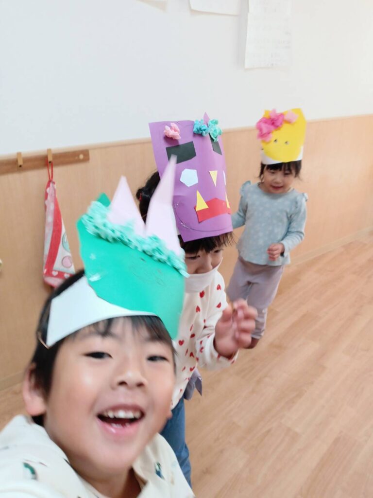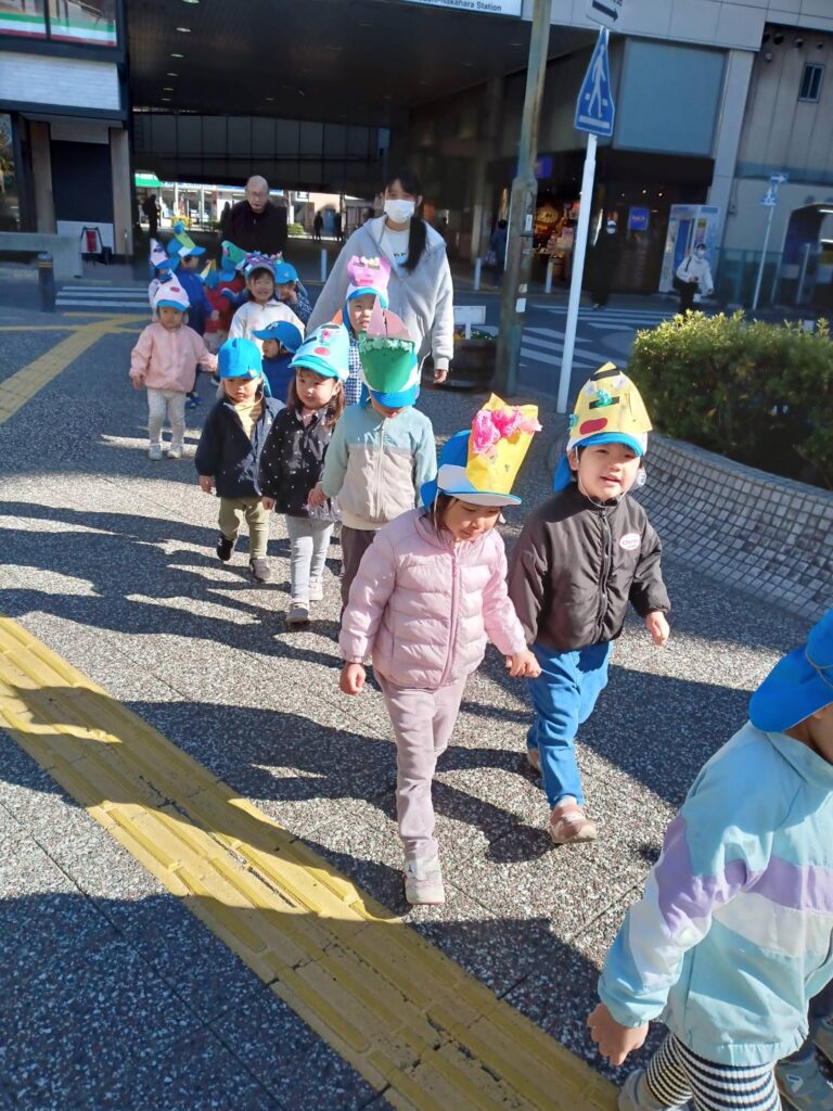 豆まきをした後は、自分たちで作った鬼のお面をつけて散歩へ行きました。