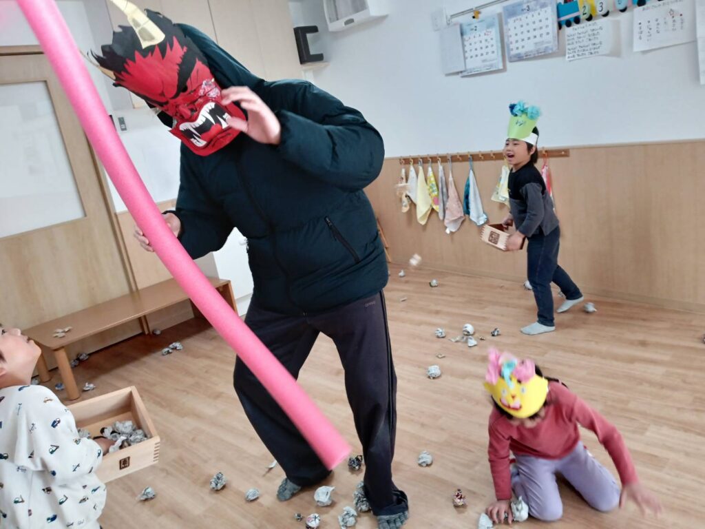 最初はビックリしてなかなか声が出なかったですが「おにはーそと!!」「ふくはーうち!!!」元気いっぱいに豆を投げて追い払いました。