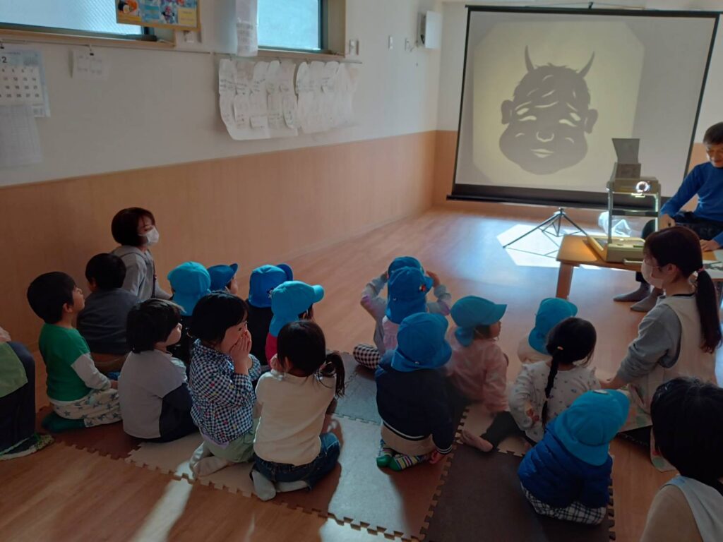 豆まき以外にも影絵で節分クイズや恵方巻き製作をして節分について楽しく学ぶことができました。