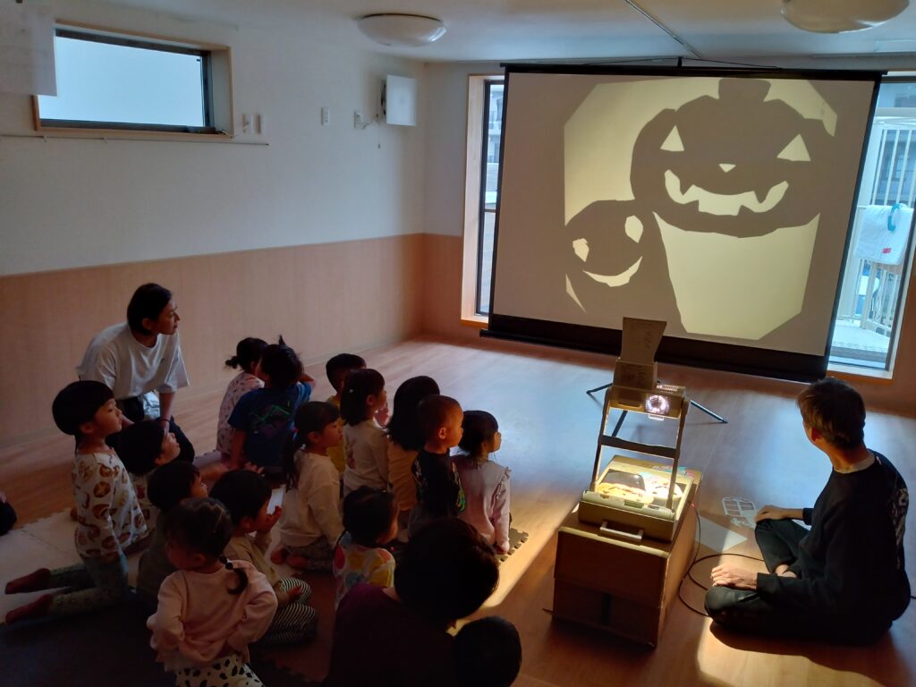 黄色さんたちが作ったカボチャやおばけの影絵も映してもらい「とっても上手に出来てるね!」と紙切り師匠の園長先生から褒めてもらいうれしそう(^O^)